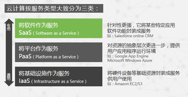 - PAAS:将应用程序运行环境封装成服务,使用户不用再关心基础服务的运维等,而只需要关心应用本身的开发。