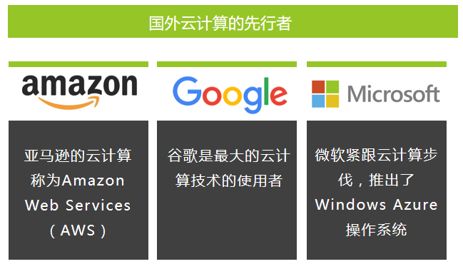 - 率先在全球提供了弹性计算云EC2(Elastic Computing Cloud)和简单存储服务S3(Simple Storage Service),为企业提供计算和存储服务。