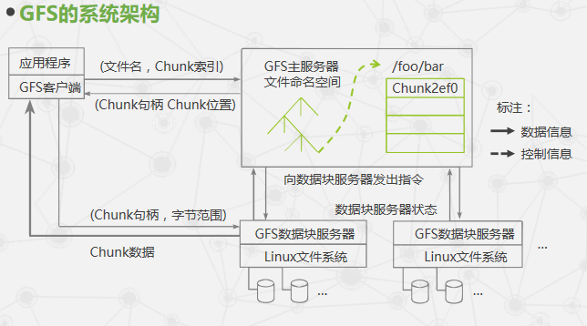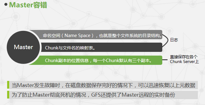 - 故障检测技术: GFS构建在不可靠廉价计算机之上的文件系统,由于节点数目众多,故障发生十分频繁