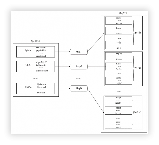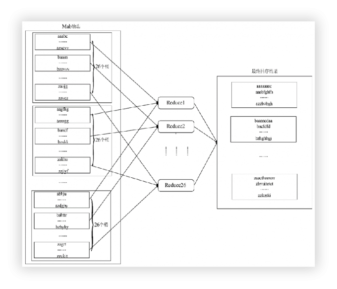 - 对于Map之后得到的中间结果,启动26个Reduce。