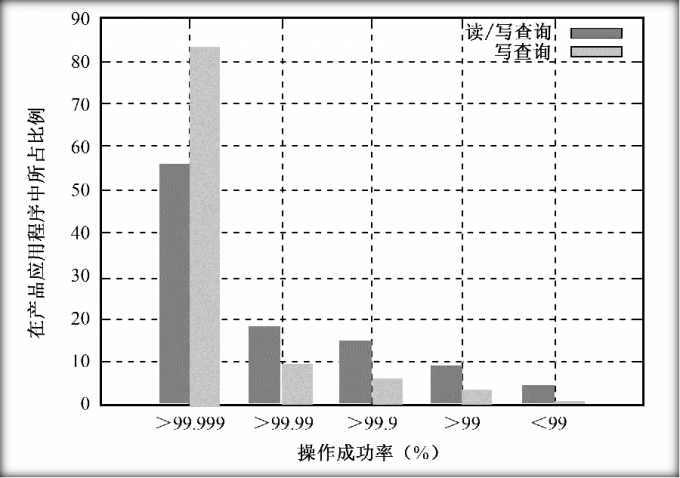 从图中可以看出,绝大多数产品具有极高的可用性(>99.999%)。这表明Megastore系统的设计是非常成功的,基本达到了预期目标