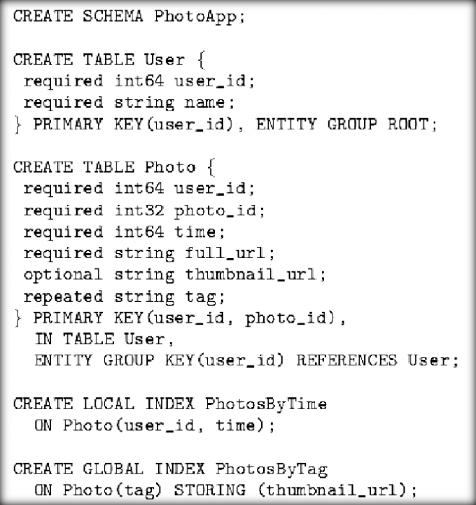 同关系型数据库一样,Megastore的数据模型是在模式(schema)中定义的且是强类型的(strongly typed)
