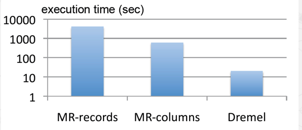 MR从面向记录转换到列状存储后性能提升了一个数量级(从小时到分钟),而使用Dremel则又提升了一个数量级(从分钟到秒)