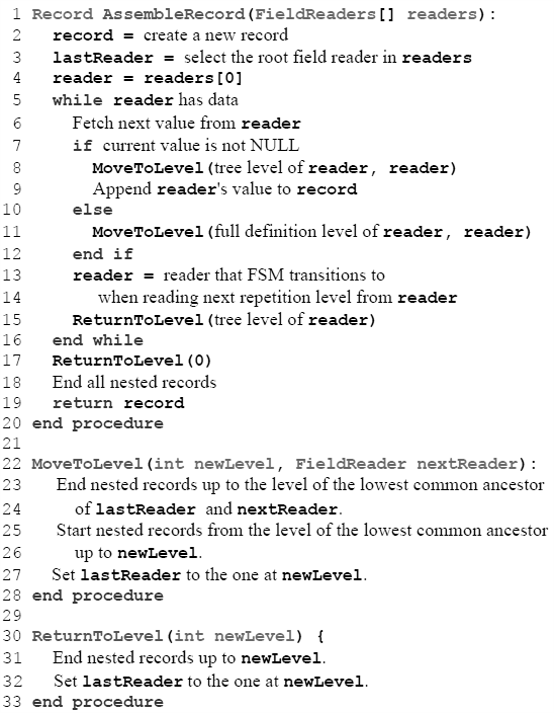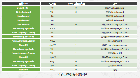 Dremel数据重组方法的核心思想是为每个字段创建一个有限状态机(FSM),读取字段值和重复深度,然后顺序地将值添加到输出结果上。