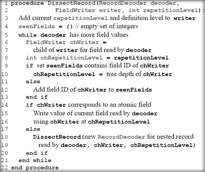 Dremel 采用嵌套模型,采用列存储,因此需要把存储的数据进行重组才能还原为记录 的形式。Dremel的每–列会被存储为块的集合,每个块又包含重复深度和定义深度,根据 重复深度和定义深度确定相应块的字段值属于哪条记录的哪个字段。
