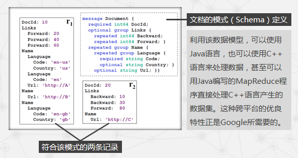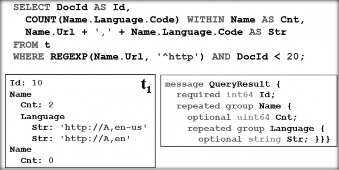 Dremel的SQL查询输入的是一个或多个嵌套结构的表以及相应的模式,而输出的结果是一个嵌套结构的表以及相应的模式。