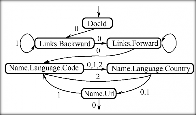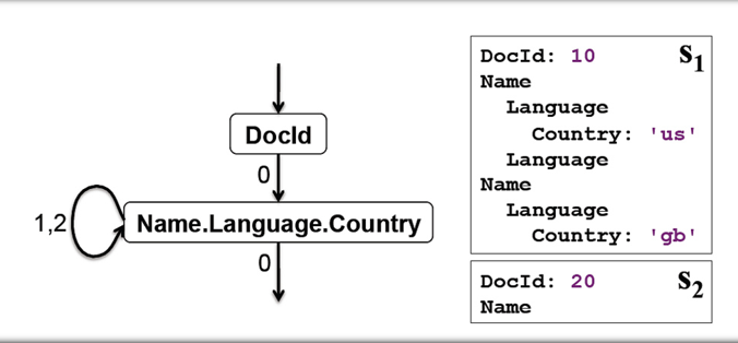 如果具体的查询中不是涉及所有列,而是仅涉及很少的列的话,上述数据重组的过程会更加便利,下图中仅仅涉及DocId和Name.Language.Country的有限状态机。