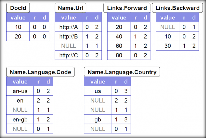 带有重复深度和定义深度的r1与r2的列存储: