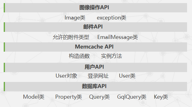 (1)图像操作API。(2)邮件API。(3) Memcache API。(4) 用户API。(5)数据库API。