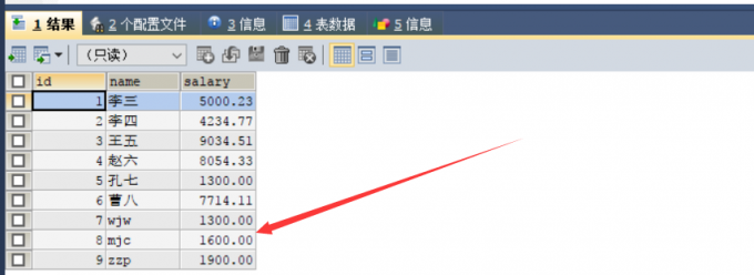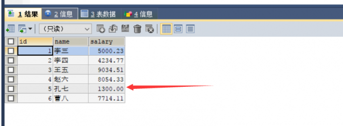 实验2:将id=5的记录的salary字段更新为1300.00