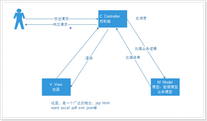 2、 视图(View):视图通过控制器从模型获得要展示的数据,然后用自己的方式展现给用户,相当于提供界面来与用户进行人机交互。通常有前端和java开发人员完成,代码量较多。