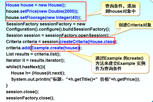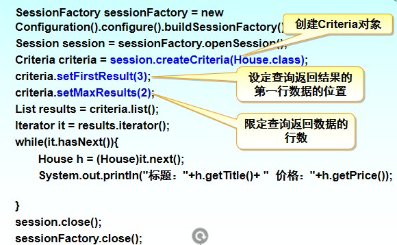 SessionFactory sessionFactory = new Configuration().configure() .buildSessionFactory(); Session session = sessionFactory.openSession(); Criteria criteria = session.createCriteria(House.class); //加入Order 条件并以价格降序的方式排列 criteria.addOrder(Order.desc(“price”)); List result = criteria.list(); Iterator it = result.iterator(); while (it.hasNext()) { House house = (House) it.next(); System.out.println(“标题:” + house.getTitle() + “ 价格” + house.getPrice()); } session.close(); sessionFactory.close();