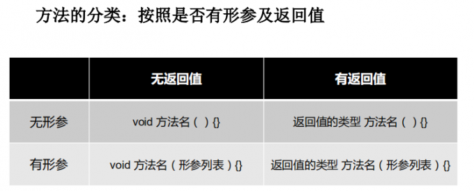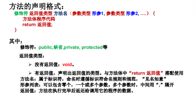 - 没有具体返回值的情况,返回值类型用关键字void表示,那么方法体中可以不必使用return语句。如果使用,仅用来结束方法。
