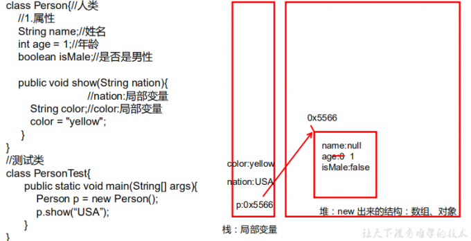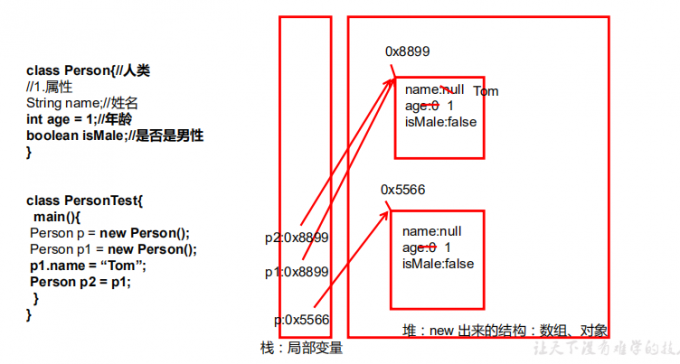 当一个对象被创建时,会对其中各种类型的成员变量自动进行初始化赋值。除了基本数据类型之外的变量类型都是引用类型,如上面的Person及前面讲过的数组。