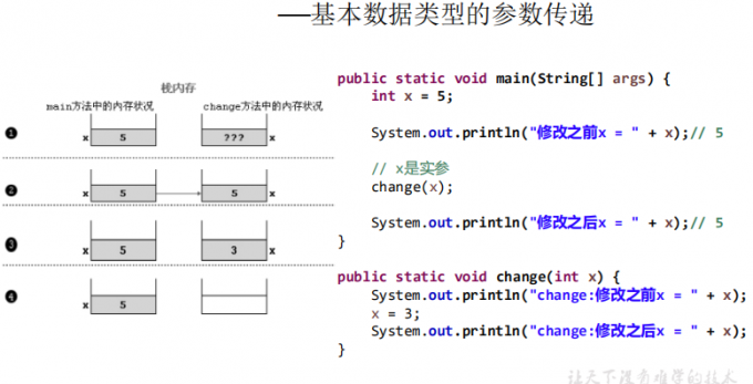 Java里方法的参数传递方式只有一种:值传递。 即将实际参数值的副本(复制品)传入方法内,而参数本身不受影响。