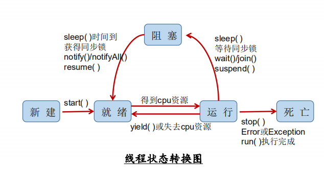 - 一个线程对象只能调用一次start()方法启动,如果重复调用了,则将抛出以上 的异常“IllegalThreadStateException”。