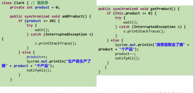 取走产品,店员一次只能持有固定数量的产品(比如:20),如果生产者试图生产更多的产品,店员会叫生产者停一下,如果店中有空位放产品了再通知生产者继续生产;如果店中没有产品了,店员会告诉消费者等一下,如果店中有产品了再通知消费者来取走产品。