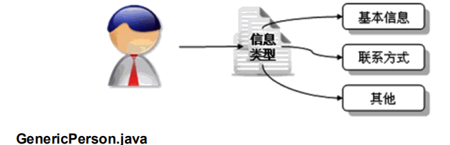 用户在设计类的时候往往会使用类的关联关系,例如,一个人中可以定义一个信息的属性,但是一个人可能有各种各样的信息(如联系方式、基本信息等),所以此信息属性的类型就可以通过泛型进行声明,然后只要设计相应的信息类即可