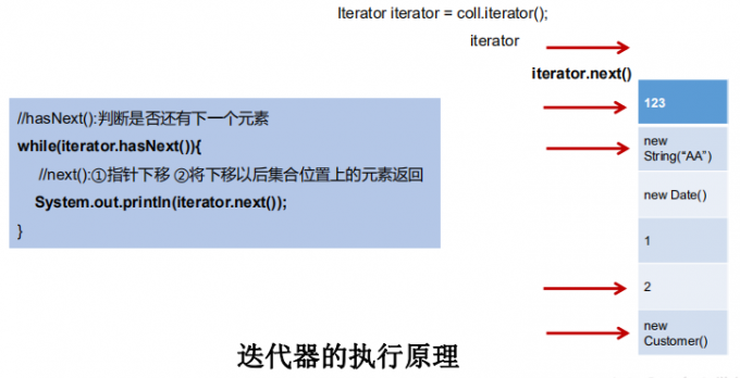 - 集合对象每次调用iterator()方法都得到一个全新的迭代器对象,默认游标都在集合的第一个元素之前。